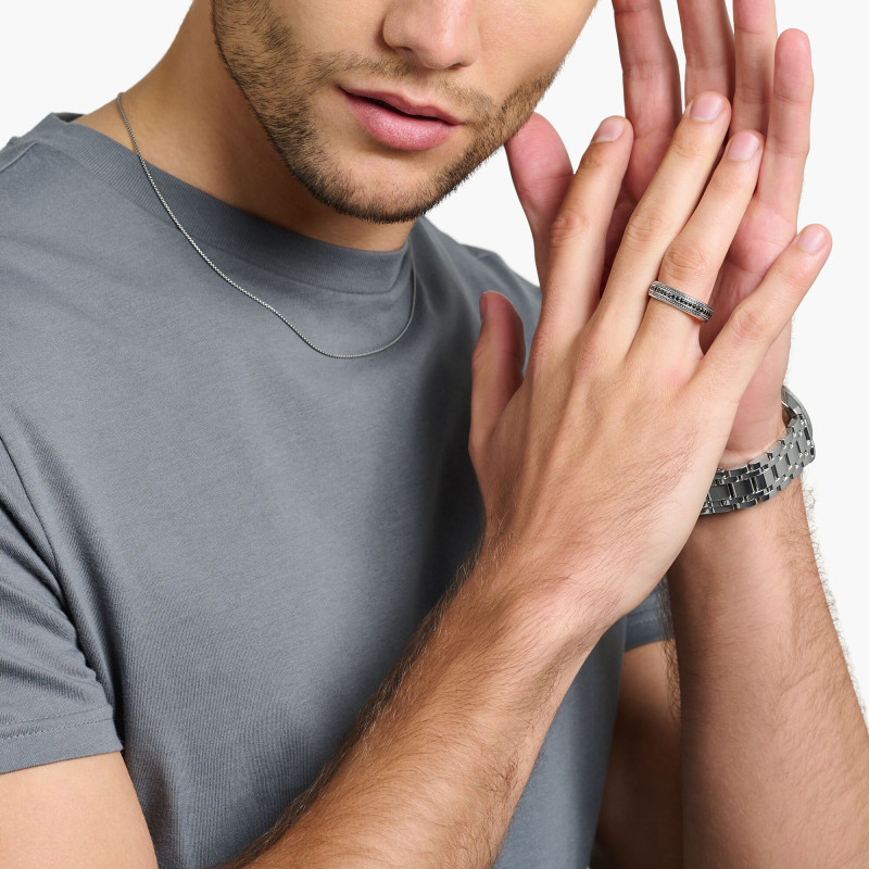 Plongez dans l'énigmatique éclat de la bague Eternity, un chef-d'œuvre en argent massif 925/1000 qui semble capturer la lumière de l'univers. Sa largeur de 7,00 mm embrasse élégamment le doigt, paré d'une danse infinie d'oxydes de zirconium noirs en une somptueuse symphonie. Fabriquée en Allemagne, cette bague s'adresse à ceux qui cherchent à sublimer chaque instant de leur vie.