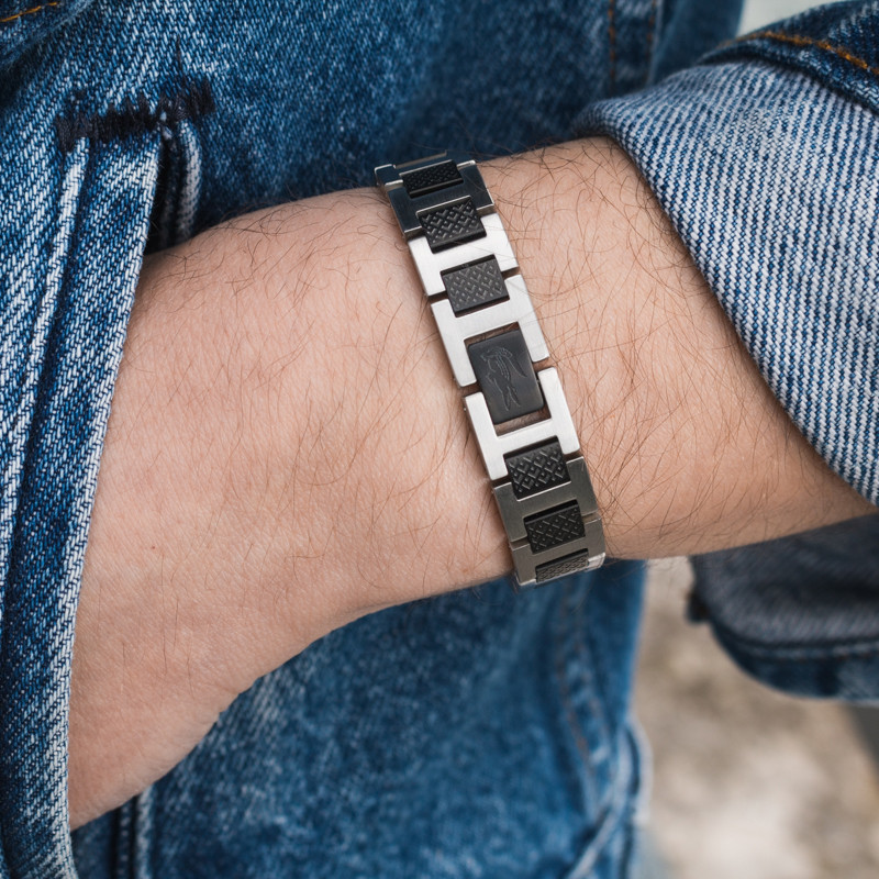 Le bracelet Metropole "L" est une ode à l'élégance masculine moderne. En acier inoxydable aux couleurs raffinées de noir et de gris, il incarne une allure urbaine et sophistiquée. Doté d'un fermoir clipable, il s'ajuste gracieusement entre 13 cm et 19 cm, s'adaptant à toutes les poignets avec une finesse inégalée. Profitez de cette pièce exceptionnelle pour sublimer votre poignet avec grâce et assurance. Ce bracelet est accompagné d'une garantie de 2 ans, symbole de qualité et de durabilité.