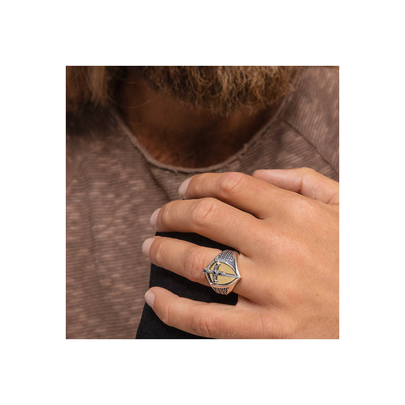 Découvrez la Chevalière Armure Épée, une fusion magistrale d'Argent massif 925/1000 et de plaqué Or 750/1000 (18K). Cette bague pour homme, éclatante de nuances jaunes, est magnifiquement ornée d'oxydes de zirconium noirs. Sa largeur de 17,00 mm et son épaisseur de 8,00 mm confèrent une présence imposante et une stature inégalée, tandis que sa hauteur de 23,00 mm témoigne de sa grandeur. Un design audacieux orné de sertis massé et à grains, cette chevalière incarne la puissance et la sophistication. Votre investissement est protégé par une garantie de 2 ans.