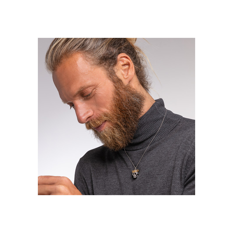 Orné d'une symbolique à la fois mystérieuse et royale, le collier Tête de Mort et couronne est une œuvre masculine en argent massif 925. Paré d'un éclat de Plaqué Or 750 (18K), il se déploie en majesté, capturant la lumière avec ses pierres noires en oxyde de zirconium, délicatement serties sur sa couronne sertie massé. Ce collier, à l'allure mate et satinée, raconte une histoire fascinante et intrigante, idéale pour l'homme en quête d'une distinction subtile et raffinée.