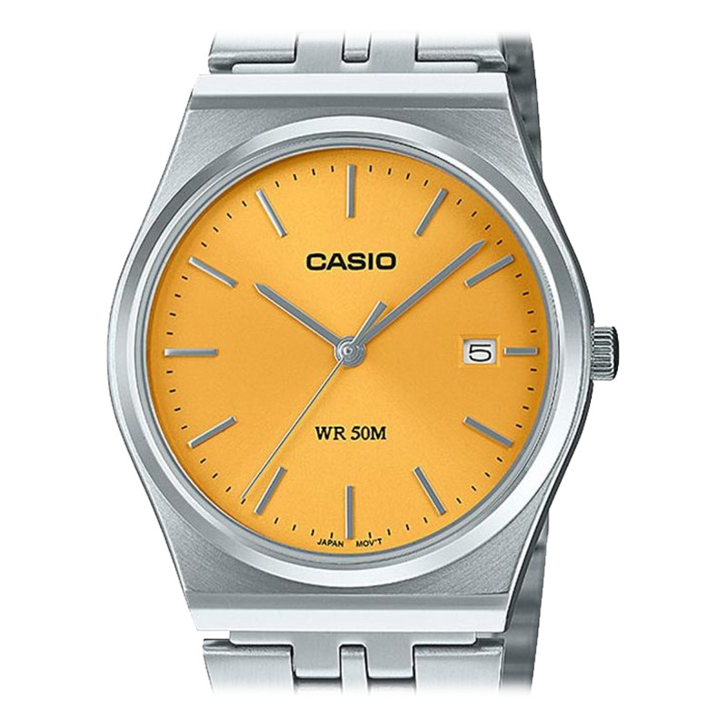 Cette montre est fabriquée en acier inoxydable pour une durabilité assurée. Son cadran jaune soleil, finement brossé, offre une lecture facile grâce à l'affichage analogique avec aiguilles et index. L'élégance du boîtier tonneau brossé contraste harmonieusement avec le bracelet en acier poli, tandis que le verre minéral protège le cadran des aléas du quotidien. Equipée d'un mouvement quartz japonais, cette montre garantit une précision optimale sur le long terme. L'étanchéité à 5 ATM vous permet de l'adopter en toutes circonstances.