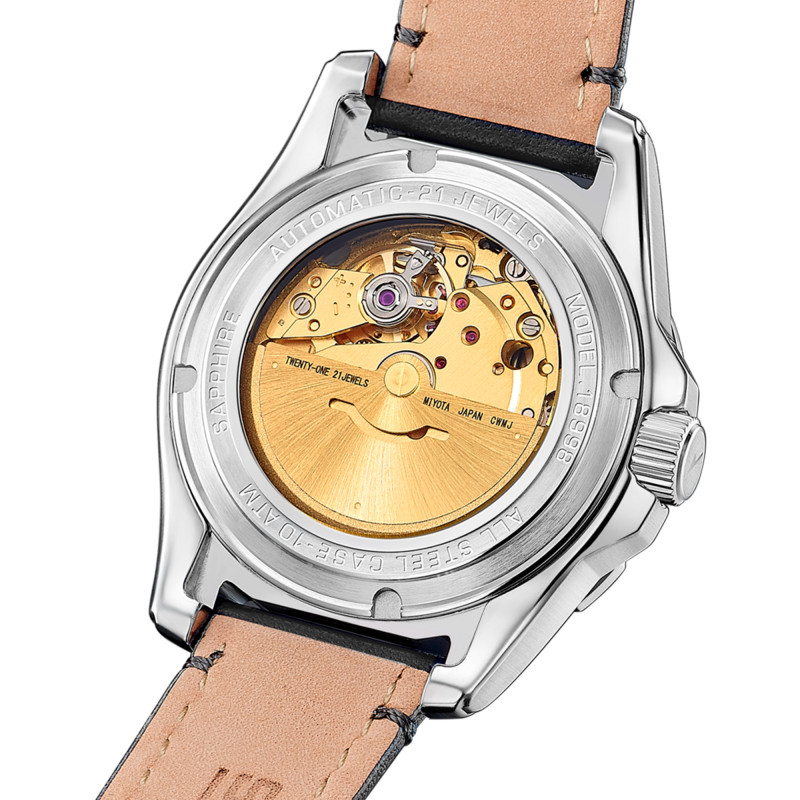 Cette montre se distingue par son boîtier rond en acier inoxydable au fini poli et brillant, abritant un mécanisme automatique japonais Miyota M8205. Son cadran soleillé noir est protégé par un verre saphir d'une qualité inégalée, promettant résistance et éclat durable. Pour vous assurer confort et allure, le bracelet est en cuir de bovin noir, agrémenté de surpiqûres, et doté d'une boucle ardillon. Avec des aiguilles et des index luminescents, vous naviguerez dans le temps avec aisance, même dans l'obscurité.