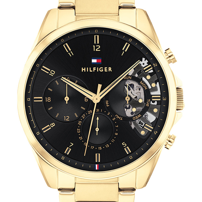 Fabriquée en acier inoxydable avec une finition PVD jaune éclatante, la montre rayonne d'une élégance intemporelle. Son cadran noir, au design coeur ouvert, révèle sa complexité interne, tandis que ses aiguilles dorées se déplacent gracieusement sur un fond soleillé. Outre sa beauté visuelle, elle embarque un mouvement quartz de haute précision et propose un affichage analogique des heures, des minutes, et des secondes, avec supplément de date et fonction chronographe.