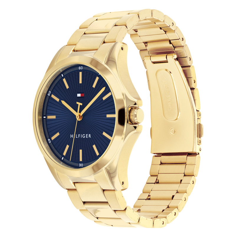 La Montre Bruce présente un boîtier en acier inoxydable de qualité supérieure, accentué par une finition PVD jaune qui capte la lumière et le regard. Son cadran bleu marine est orné d'index élégants et de chiffres arabes, renforçant sa lisibilité et la précision de ses mouvements quartz. Le bracelet, également en acier PVD Gold, apporte la touche finale d'élégance, avec une finition alternée d'acier brossé et poli. Dotée d'un fond vissé et d'une étanchéité de 3 ATM, elle est aussi robuste qu'esthétique.