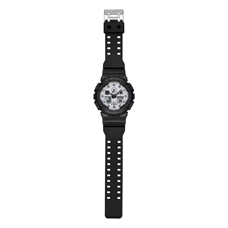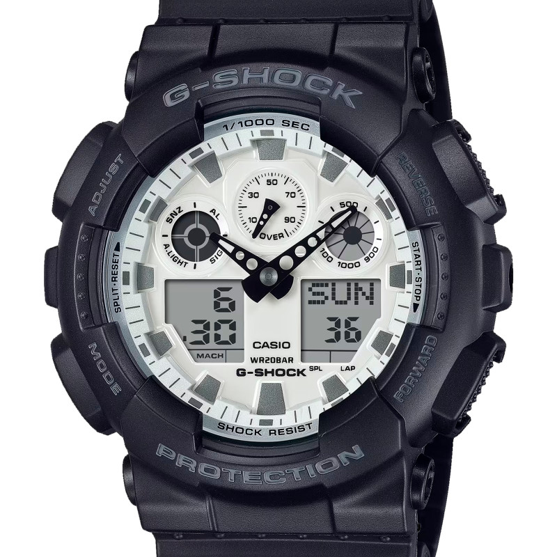L'association de l'affichage analogique et numérique permet à la G-Shock GA-100 de fournir une lecture claire et rapide en toutes circonstances. Que vous soyez plongé dans l'obscurité grâce à son éclairage LED ou sous la lumière éclatante du soleil, les informations affichées resteront parfaitement lisibles. Ainsi, que ce soit pour surveiller l'heure, mesurer vos performances grâce au chronomètre au 1/1000ème de seconde ou simplement vérifier l'alarme de votre réveil, tout est intuitif et à portée de regard.