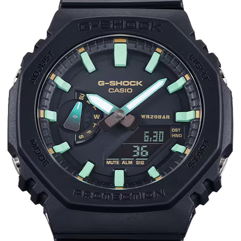 Le cadran de couleur noir mat est agrémenté de marqueurs et aiguilles turquoise lumineuses, offrant une lisibilité optimale même dans l'obscurité. Son affichage à la fois analogique et numérique vous offre une polyvalence exceptionnelle, tandis que ses fonctions complètes telles que chronomètre, alarme, et compte à rebours, ajoutent une dimension pratique à votre quotidien. Mais ce qui distingue vraiment la Casio G-Shock GA-2100RC-1AER, c'est son extrême résistance à l'eau. Résistante jusqu'à 200 mètres, cette montre est idéale pour les amateurs de natation, de plongée et pour toutes les activités nautiques. Imaginez-vous défiant les vagues, sans jamais craindre pour votre montre.