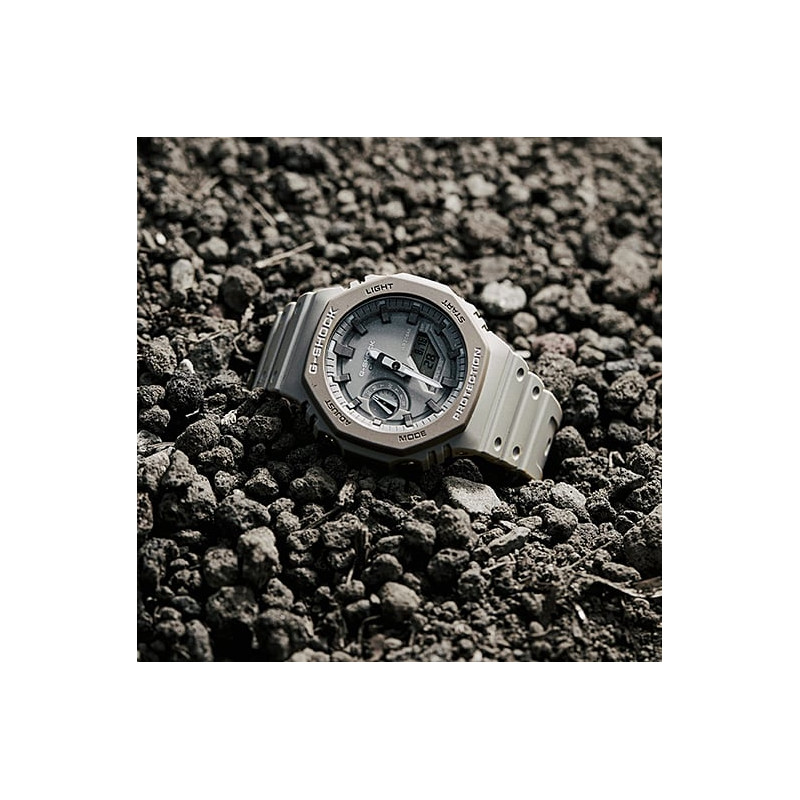 Ce qui rend cette montre exceptionnelle, c'est aussi sa résistance inégalée à l'eau, certifiée pour une pression allant jusqu'à 20 bars. Que vous soyez un passionné de plongée, de natation ou simplement un aventurier soucieux de la fiabilité de votre équipement, cette G-Shock vous suit jusque sous l'eau, à une profondeur impressionnante de 200 mètres. Mais la G-Shock ne se contente pas de sa solidité phénoménale. Elle marie haute technicité et modernité avec un affichage mixte analogique-numérique qui offre une lisibilité sans pareil. Les aiguilles luminescentes, renforcées par le rétroéclairage LED, assurent une visibilité parfaite dans les conditions les plus basses en lumière.