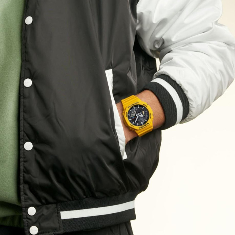 Le design de cette montre est aussi audacieux que fonctionnel. Son bracelet jaune vif et son boîtier rond en résine lui confèrent non seulement une allure moderne et élégante, mais aussi une grande résistance. Le cadran noir offre un contraste saisissant avec le jaune éclatant du bracelet, permettant une visibilité optimale des indications analogiques et numériques. Les aiguilles et marqueurs luminescents garantissent une lisibilité parfaite, même dans l'obscurité.