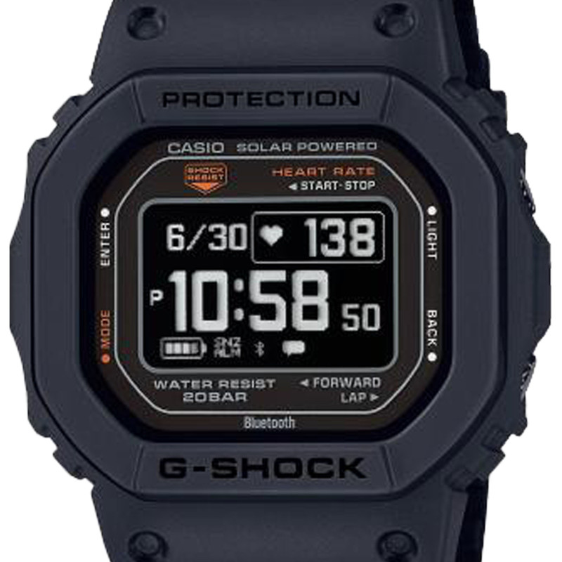 Concernant l'affichage, le cadran numérique de cette G-SHOCK assure une lecture claire et facile des informations cruciales telles que l'heure, la date, et bien sûr, votre fréquence cardiaque. Les choix esthétiques faits en termes de couleurs, comme le noir intégral rehaussé par des touches de blanc et d'orange, garantissent un contraste saisissant qui optimise la visibilité. Fidèle à sa réputation, cette G-SHOCK offre une protection renforcée contre les chocs, idéale pour ceux qui participent à des activités intenses ou travaillent dans des environnements exigeants. Son verre minéral plat protège efficacement le cadran contre toutes sortes de rayures et impacts quotidiens.