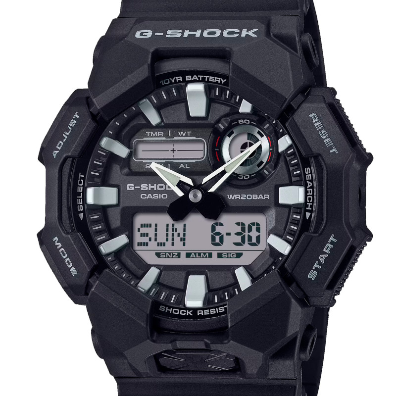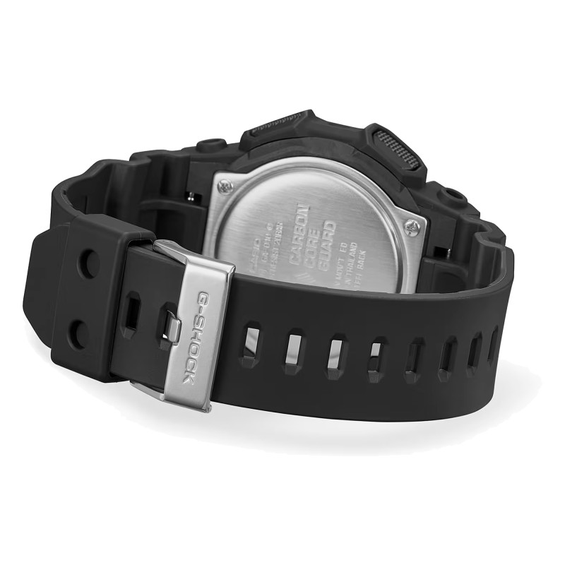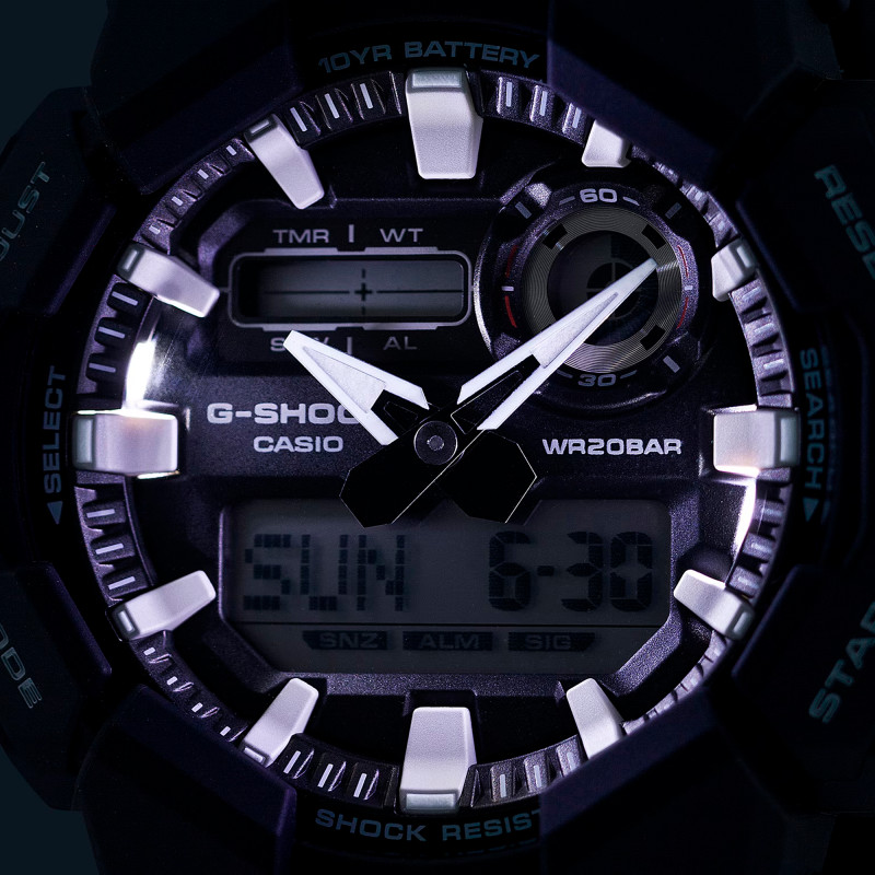 L'audace du design est ce qui distingue immédiatement la G-Shock Sport Noir. Son boîtier octogonal est non seulement esthétiquement plaisant mais offre également une protection remarquable contre les chocs et les impacts. La résine noire associé à du carbone rehausse le look sportif et élégant, parfait pour toute occasion, que ce soit pour un rendez-vous d'affaires ou une aventure extrême. Les boutons latéraux sont intelligemment positionnés pour faciliter l'accès aux nombreuses fonctionnalités, incluant le chronomètre, le compte à rebours et l'alarme quotidienne. La lisibilité optimale, de jour comme de nuit, est assurée par un écran analogique-numérique avec des aiguilles et des marqueurs luminescents. De plus, l'incroyable super illuminator garantie une lecture facile, même dans l'obscurité totale.