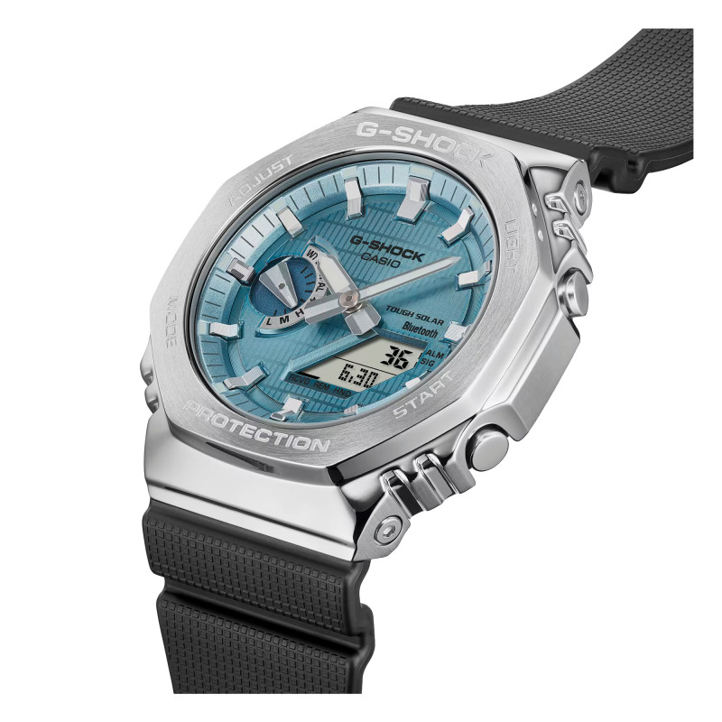 Le cadran bleu ciel de cette Casio G-Shock est bien plus qu'un simple indicateur de temps. Il est doté de technologies innovantes telles que les index luminescents qui facilitent la lecture de l'heure, même dans l'obscurité la plus totale. L'ajout d'un écran numérique intégré élargit les possibilités d'affichage, offrant non seulement l'heure mais aussi la date, le jour et des alarmes.