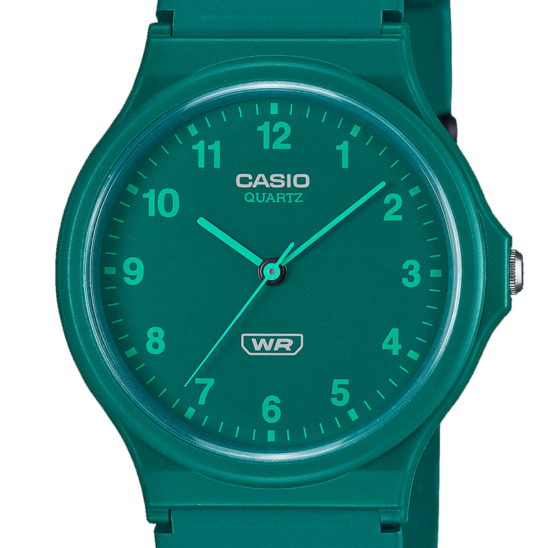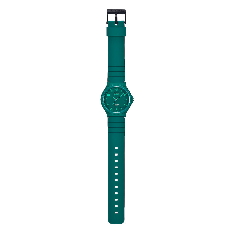 Cette montre arbore un boîtier rond en résine reflétant un vert captivant qui ne passe pas inaperçu. Le cadran soleillé est protégé par un verre acrylique, garantissant résistance au quotidien. Fonctionnant grâce à un mouvement quartz signé Casio, elle offre un affichage analogique clair avec des aiguilles précises pour les heures, minutes et secondes. Son bracelet en résine ajuste parfaitement ce bijou à votre poignet, complété par un fermoir boucle ardillon pour un maintien sûr.